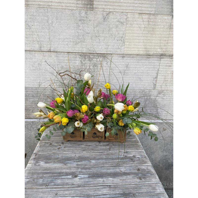 Aranjament cu 35 fire de lalele colorate în completare cu Eucalipt Crengi de Corylus, Beargrass în sertar de lemn rustic