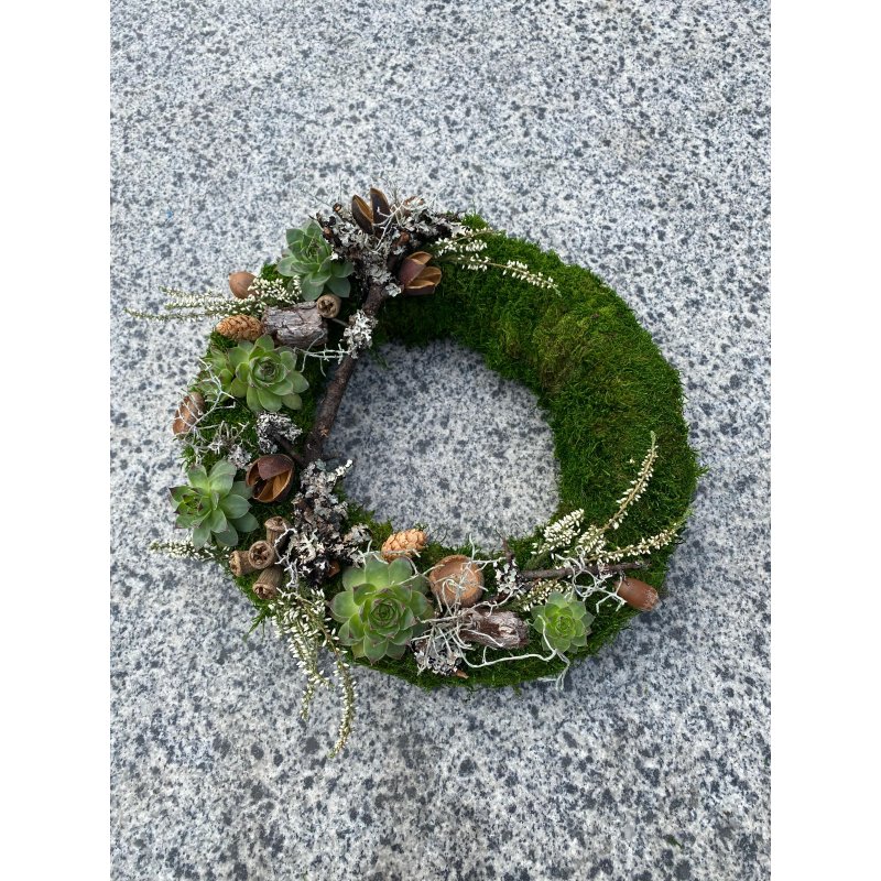 Coronita de muschi cu suculente si flori uscate