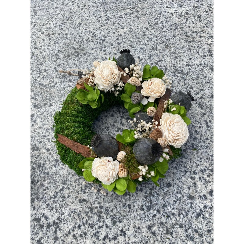 Coronita de muschi decorat cu flori si plante uscate , 20 cm